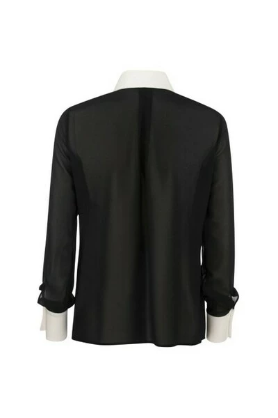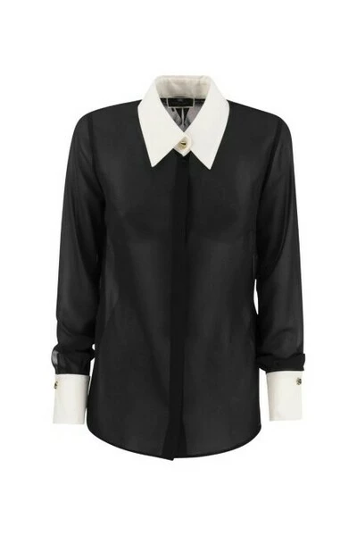 Elisabetta-franchi-shirts zwart shirt met lange mouwen in Georgette, met een slanke pasvorm met kraag en manchetten in katoenen popelin in contrasterende kleur en centrale opening met Engelse placket. • Georgette shirt met lange mouwen • Rechte lijn • Contrastkraag en manchetten • Centrale opening naar Engelse artikelsamenstelling 100% polyester