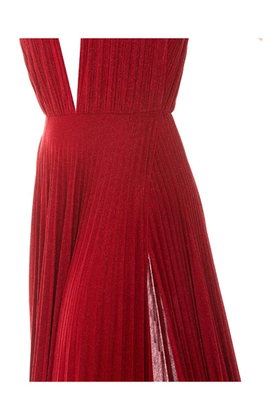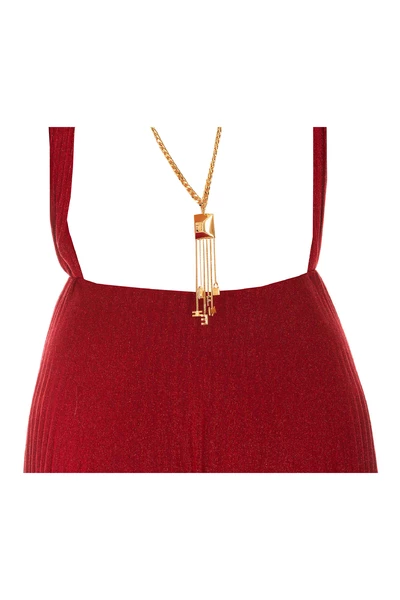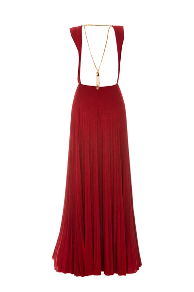 Elisabetta franchi rode vrouw lange jurk met lichaamsafsluiting, tule detail op de voorkant, brede en wijd uitlopende halslijn, mouwloos, kettingdetail op de achterkant, glittereffect