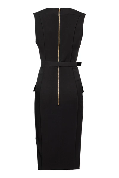 Elisabetta-franchi-jurken zwarte zwarte mouwloze midi-jurk met riem, v-hals, mouwloos, gemonteerde taille en gemiddelde lengte. Strak zittend; Gemiddeld gewichtsstof