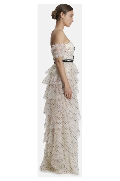 Lange jurk in tule met stippen. Borstrok met parels en strass geborduurd detail. Rok met asymmetrische ruches en een split aan de voorkant. Ritssluiting aan de achterkant. Normale pasvorm.