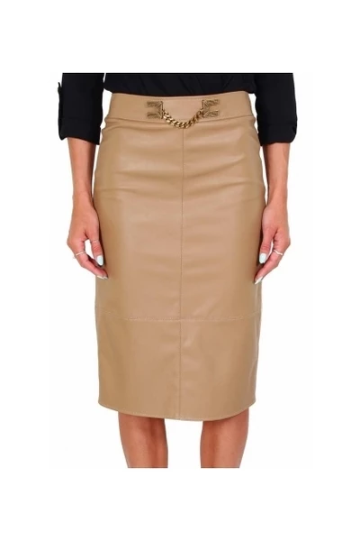 Poeslagrok in Eco -Leer met kettingdetail en metalen logo op het taille -puntdetail sluiting met onzichtbare rits op de achterkleding Lange lengte naar de kalf Kleur Tortora Samenstelling Samenstelling 100% Polyester kledingstuk Grootte 40 Modelhoogte 1,80 cm Maat 40