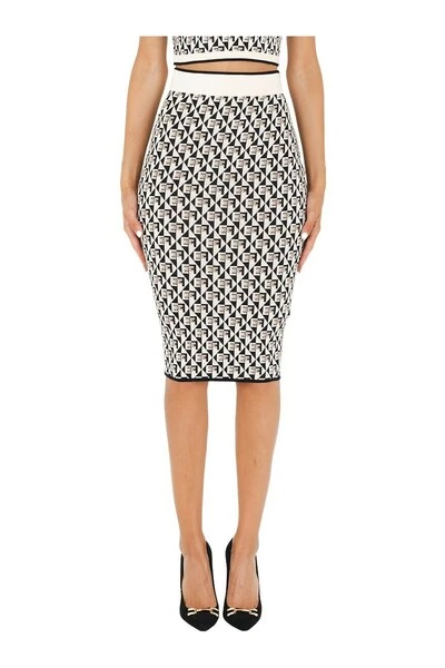 Ga Elisabetta -franch in het elastische viscose -shirt met monogram logo -afdrukken van het verpleegkundige ontwerpeffect. Hoog leven met contrasterende details. Schede jurk. Zijkantafsluiting. Het model draagt maat 38.