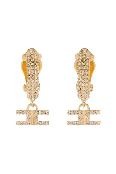 Elisabetta franchi oorbellen gemaakt van gouden metaal en strass. Hanger met logo, clip sluiting.