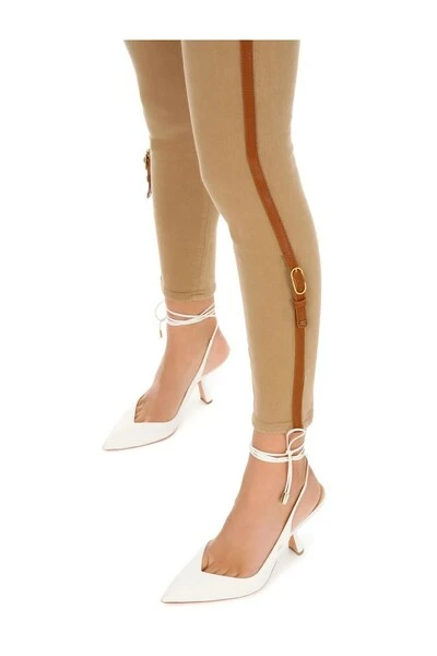 Katoen katoen jeggings in kledingstuk. Taille 5,5 cm breed, hoog schot met zijsneden. Het detail van de beugel met een helder goud gegalvaniseerd logo met eco -cast strips van dezelfde tint.