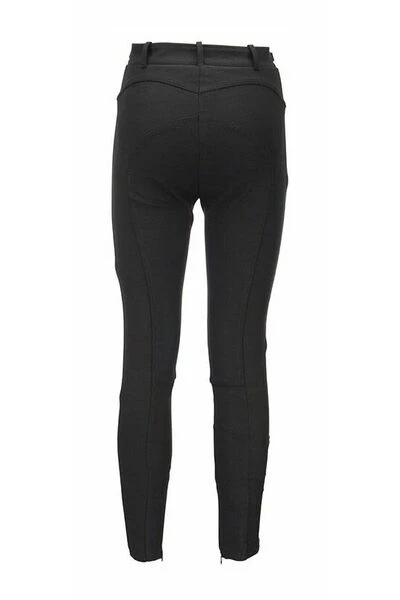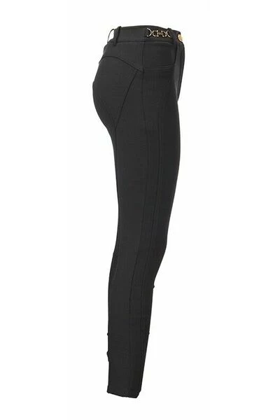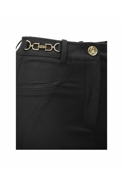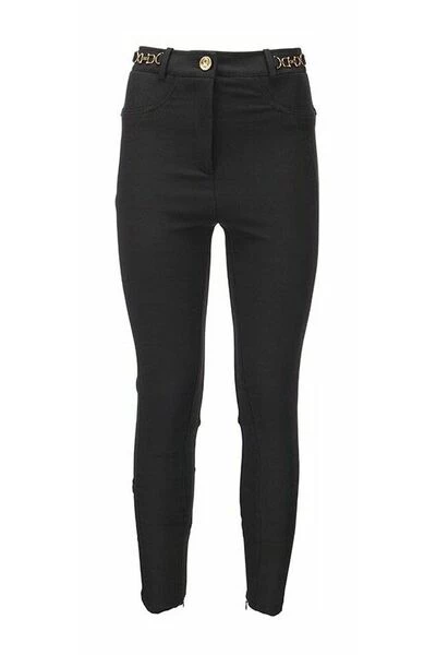 Nauwsluitende broek van viscosemixstof met een bijzonder patroon van ergonomische uitsnijdingen die doen denken aan de belijning van technische rijkleding. De taille wordt verfraaid door de toepassing van metalen klemmen op de heupen.- Broek van viscosemixstof-