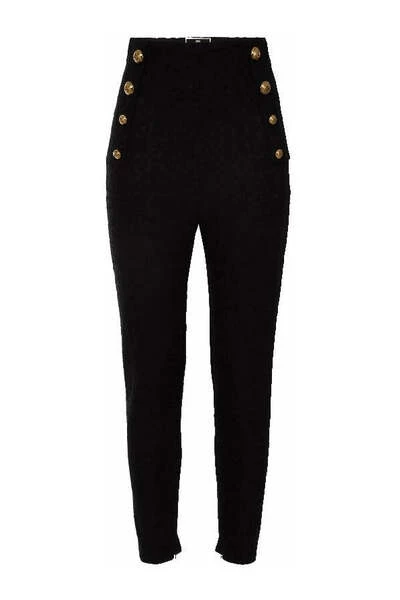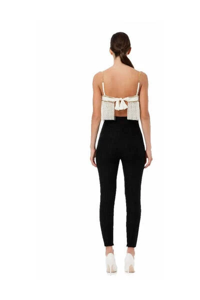 Pantalone met een strakke, hoog -geschreven lijn, in kanten nagesynchroniseerd door het geometrische bloemenontwerp, gekenmerkt door een motief van symmetrische zijknopen, logo -knoppen in gouden metaal en dunne riem met gesp met gesp en hangketen die het leven onderstreept.