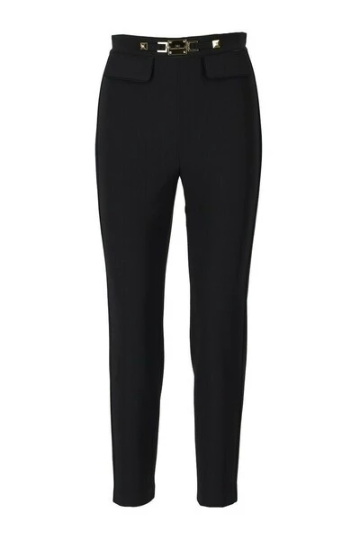 Elisabetta -franchi -broek gemaakt van zwarte synthetische stof met paardenbit en studs met logo op de taille. Zij flappen, bijpassende satijnen leidingen. Zip sluiting op de achterkant, slanke pasvorm.