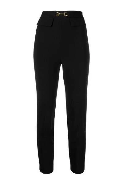 Elisabetta-franchi-broek Zwarte hoog getailleerde bijgesneden broek van Elisabetta-franchi met zwart, met hoge taille, bijgesneden, paardenbitdetail, slanke snit en twee voorste flapzakken.