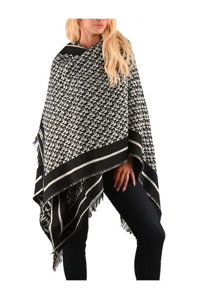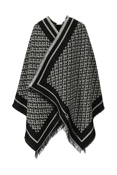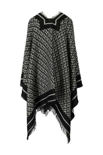 Cape van gemengde wol en viscose met monogram motief in tinten van zwart en boterkleur. Afgerasterde profielen, omkeerbaar.