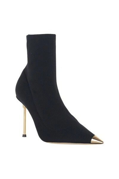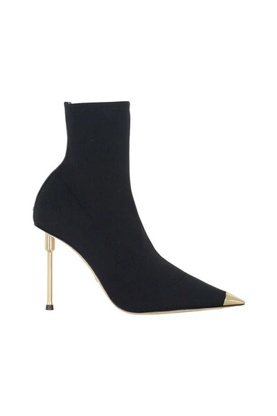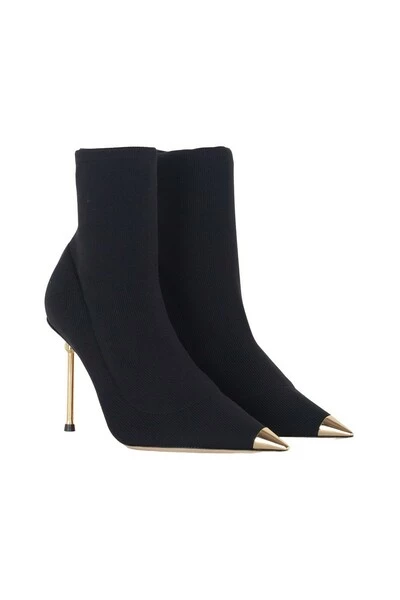 Tronchetto Elisabetta -franchi in kous in elastische stof. Leerachtige details op de hiel met micro -logo. Leren interieur. Leren zool. Dunne hak 10 cm hoog.