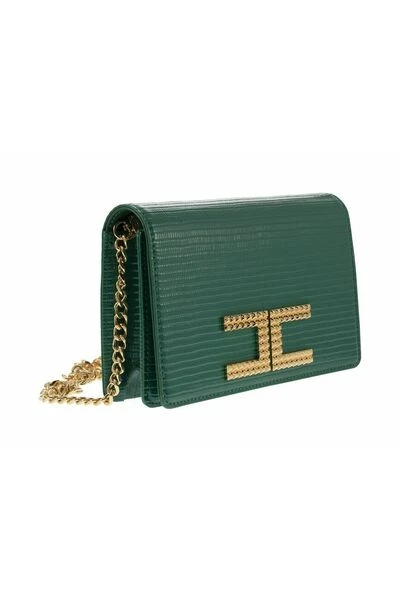Schoudertas in glanzend hagedis-effect synthetisch materiaal. Afneembare metalen groumette -ketting met snaphaken. Maxi onderzocht logo op de voorkant van de voorkant. – Antiek goudkleurig metaal