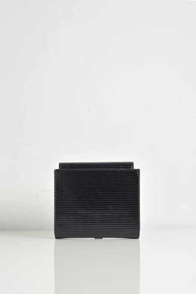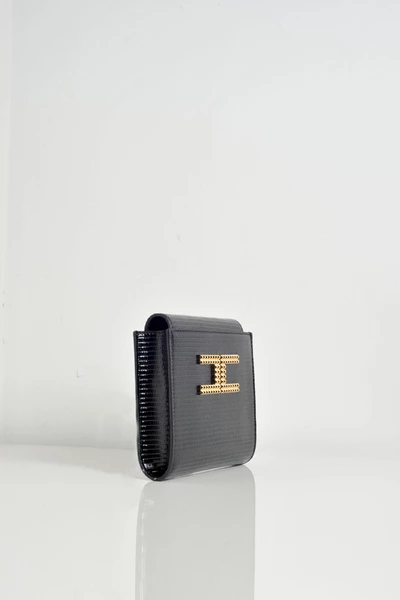 Vierkante koppeling in het lucide hagedis -effect hagedis. Zwarte kleur. Goudmetalen ketting. Maxi Gold Color Logo. Intern toegepaste pocket. Maatregelen: l 18 x h 17 x p 5 cm.