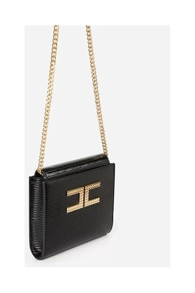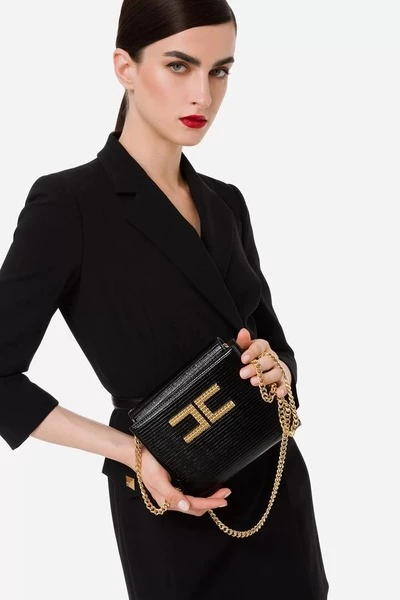 Vierkante koppeling in glanzend hagedis -effect synthetisch materiaal. Afneembare metalen groumette -ketting met schouder draagbaarheid. Maxi -logo bezaaid op de voorste wijzerplaat. Voering in synthetisch materiaal met suede effect. Antieke goudkleurige metalen. • vierkante koppeling • Lizard Effect • Groumette -ketting in goudmetaal • Maxi onderzocht logo • Suede voering • Metingen: L 18 XH 17 XP 5 cm