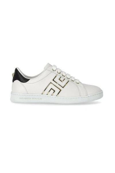 Elisabetta franchi sneaker gemaakt van ivoor leer met achterste inzetstuk in zwart leer, versierd met een gouden metalen maxi -stud. Contrasterend logo aan de zijkant, witte katoenen veters en rubberen zool met gegraveerd logo. Hoogte 2,5 cm.