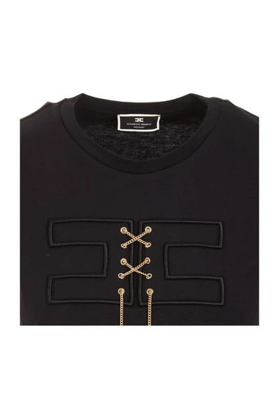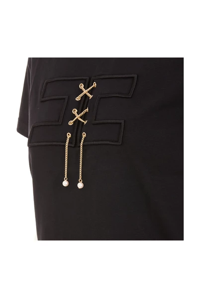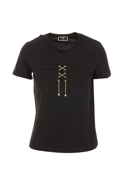 Zwart katoenen t-shirt van Elisabetta-franchi met korte mouwen, ronde nek, regelmatige fit en goudkleurige dwarsketen-borduurwerk.