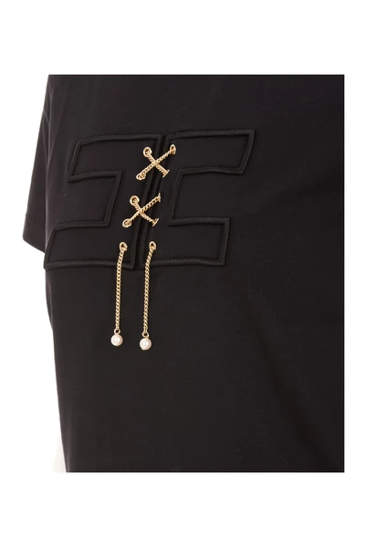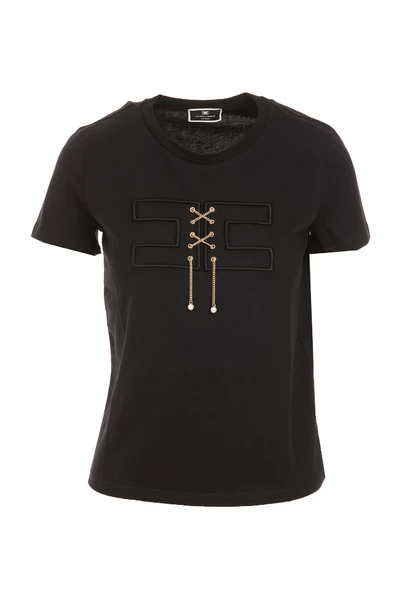 Elisabetta Franchi Sweaters zwart T-shirt met frontaal geborduurd logo, kettingdetails, crewneck