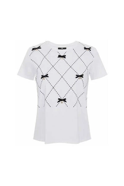 Elisabetta Franchi AI22 T-shirts met Fackets en Charms Charms Chalk/Black Woman die opgewonden raakt en weet hoe te opwinden. Omdat zijn leven zelf een emotie is. Leefde volledig zonder zichzelf te sparen, met een enkel doel: de dromen vervullen van een meisje dat haar wereld en haar ware essentie in de mode altijd heeft gezien. Een verlangen dat werkelijkheid is geworden. Kwaliteit, vakmanschap en kleermakerservaring: dit zijn de waarden die het leven geven aan de Elisabetta Franchi -collecties, voor een mode -luxe die een nieuwe standaard is geworden in de modewereld. Van de onderzoeksfase tot de studie van materialen en stoffen, tot de constructie van prototypes en de aandacht voor detail, elke productiefase wordt in detail behandeld om unieke en trotse kleding te creëren om een echt gemaakt in Italië te zijn. T-shirt met een rechte pasvorm met korte mouw en katoentrui met de voorkant geborduurd met bogen in grois en dubbele hanger die op een Losangue geborduurde flush rust. ;