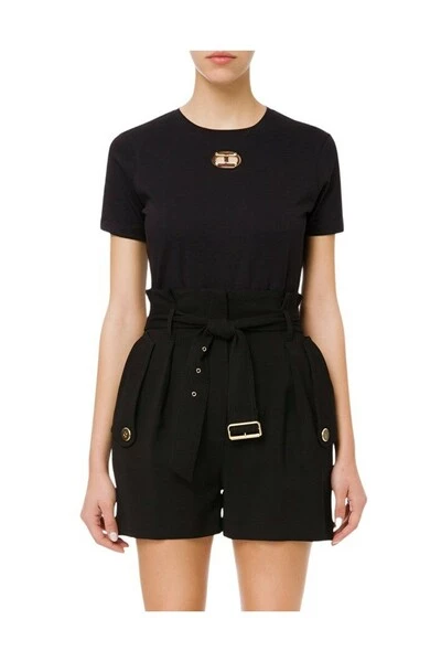 Elisabetta Franchi`s choke T-shirt met een zachte pasvorm. Het model bestaat uit korte mouw in katoentrui en wordt aangepast door een ovaal logo -accessoire in gouden metaal bedekt met lederen synthetisch materiaal, aangebracht om het effect van het effect uit te snijden. Samenstellingsdetails: 100% katoenen t-shirt korte mouw shortculse accessoire licht goud ovaal in metalen pasvorm
