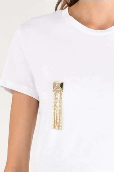 – Driter Weave- Covering- Met gouden studs met charmes van hangketens- Hofmouwen- Samenstelling: 100% katoen en 100% metaal gemaakt in Italië
