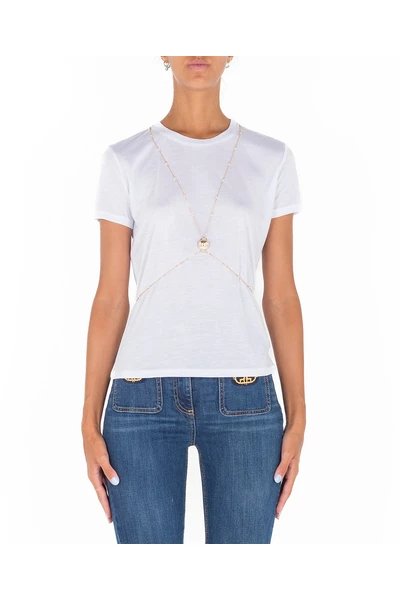 Elisabetta Franchi T-shirt in Modal. Ronde halslijn en korte mouw. Lichaamsketen detail scheidbaar met logoed synthetische parel. Het model draagt maat 40.