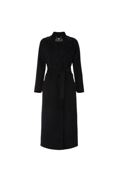 Mooie lange zwarte jas van Elisabetta Franchi, gemaakt van dubbele stof in wol en kasjmier met een rechte lijn en geen knopen, opgestikte zakken en riem in dezelfde stof om de taille te verstellen. Materiaal: 90% wol. 10% kasjmier. Deze beschrijving is automatisch vertaald.