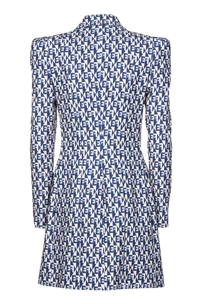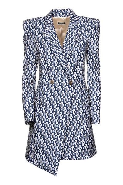 Elisabetta franchi jurken rhombus geprinte stretch crêpe mantel manteau-jurk met piek revers halslijn, asymmetrische voorkant en dubbele bakken 2-knops sluiting. Hoge gestructureerde schouders, 3/4 mouwen en flapzakken. De EF -logo -knoppen in gouden metaal weerspiegelen het logo op de afdruk.