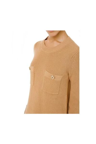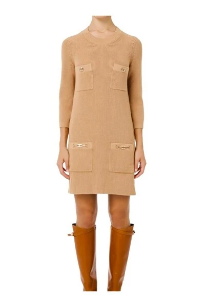 Round-necked chokerpaneel tas met 3/4 mouwen. Logo klem gestikt op de vier zakken. Tas jurk • 3/4 mouw • Vier zakken • Lichtgouden accessoires • FIT ARTIKEL 70% Viscose 30% polyester