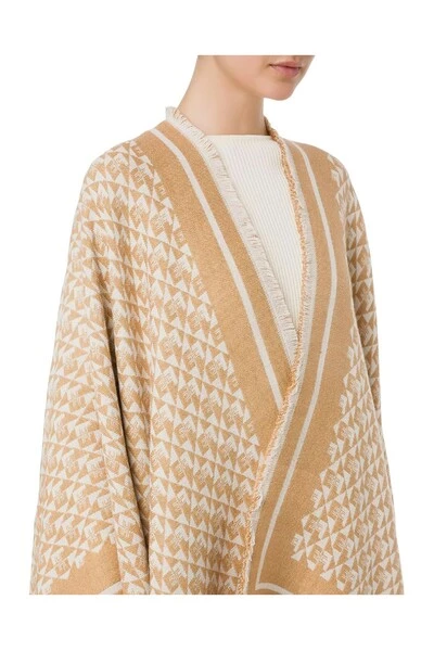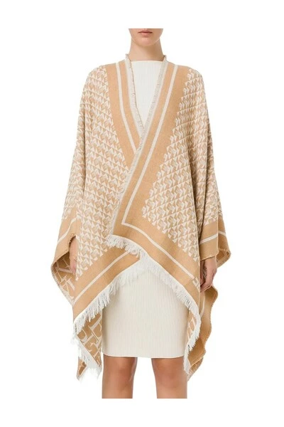 Materiaal: 40% wol, 40% acryl, 20% viscosadotagli: jacquard mantella met letters, dubbele faceColore: kameel en burromade in: Italië