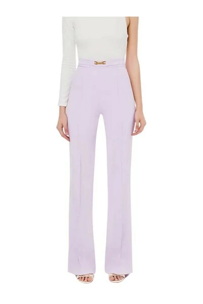 Palazzo -broek met hoge tailleband, logo -accessoire in het midden en verticale sneden in het midden van het been op zowel de voor- als achterkant. Flapzakken met door logo-geëxciteerde metalen knoppen aan de achterkant.