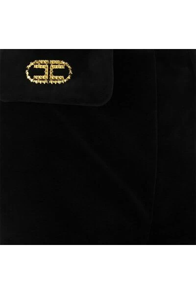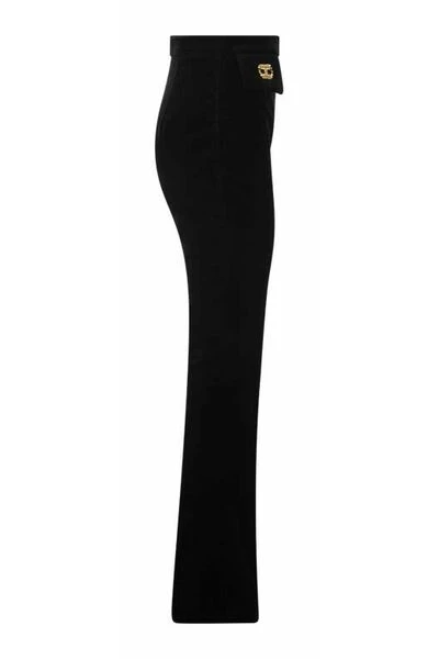Velvet broek met een dicht passend silhouet enigszins uiteenlopen aan de onderkant, gekenmerkt door twee fluwelen flappen lateraal onder de tailleband, verfraaid door de toepassing van goudmetaalaccessoires in de vorm van een ingebed logo.