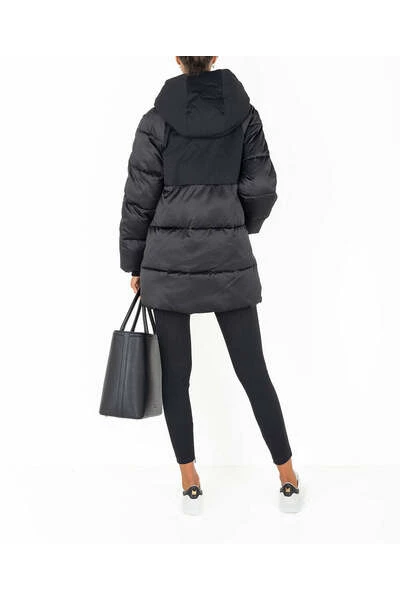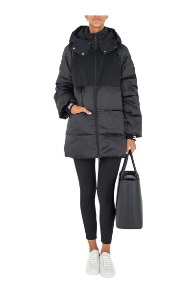 Elisabetta franchi zeiljas met technische stoffen inzetstuk. Hoge kraag met afneembare kap en lange mouw met detail Toon op toon en manchet in het logo -shirt. Horizontale zakken met zip. Dubbel -tire ritssluiting en nekknoppen. Het model draagt maat 40.