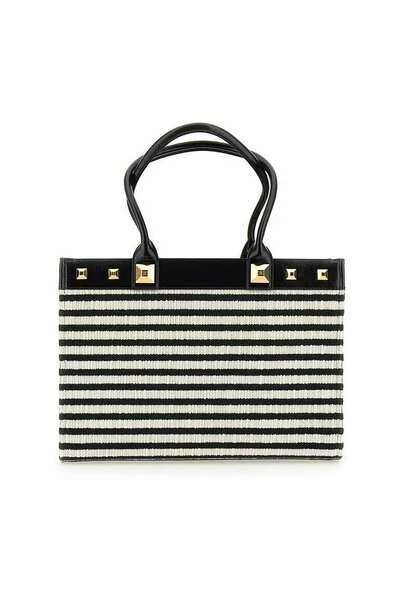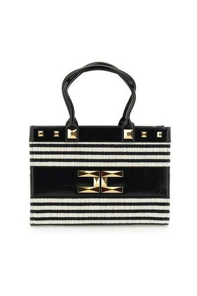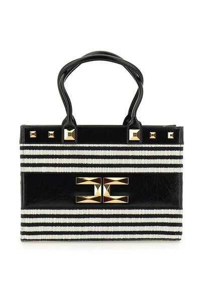 Elisabetta franchi-tassen .. Zwarte Elisabetta Franchi schoudertas, zwart en wit, shoppermodel, in gestreepte chenille-gesteunde stof, details in glanzend verfrommeld synthetisch materiaal en gefacetteerde gele goudkleur en logo -patch, voeten metaal bij zoom, dubbele buisvormige handgreep. Afmetingen: lengte 38 cm, hoogte 25 cm, diepte 12 cm.