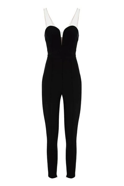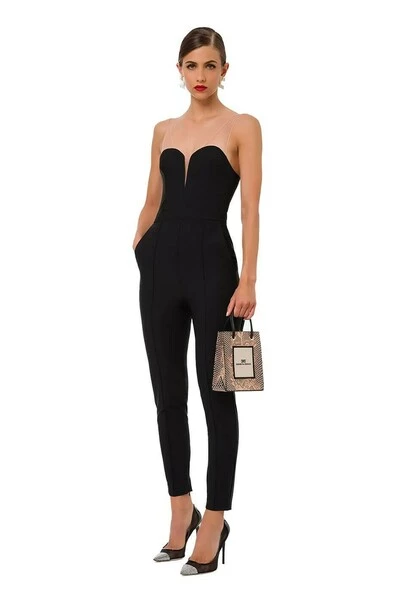 Elisabetta franchi jumpsuit gemaakt van zwarte technische stof, met een brede halslijn met naakteffect tule schouders. Franse zakken aan de zijkanten en ritssluiting aan de achterkant.