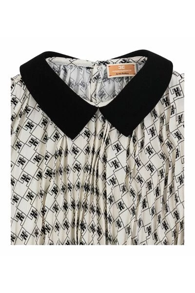 Elisabetta -franchi -jurken contrasterende kraag. All-over logo print. Knopen bevestigen. Mouwloos. Geplooid ontwerp. 100% viscose. Gemaakt in Italië