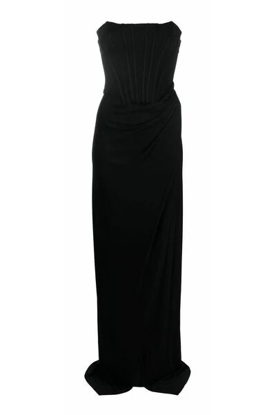 Elisabetta-franchi-jurken Black Front-Slit Bustier-jurk van Elisabetta Franchi met bustier-stijl halslijn, voorste spleet, blootgestelde achteraf aan de achterkant, strapless, lange lengte en jetzwart.