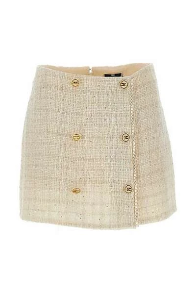 Elisabetta Franchi-rokken witte elisabetta franchi dames s minirok, witte en lurex zilveren draden, portemonnee-effect op de voor- en dubbele rij sluiting van knoppen in toon met logo metalen ring, zijafsnijdingen van hand-sewn parels, onzichtbare zipafsluiting op het rug. Gemaakt in Italië.