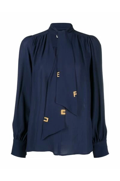 Elisabetta franchi jassen blauwe tie-fasterende blouse met lange mouwen van Elisabetta-franchi met aansluiting aan de voorkant, V-hals, lange mouwen, gebogen zoom, pullover-ontwerp en marineblauw.