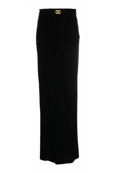 Elisabetta franchi-rokken zwart gedrapeerde maxi-rok van Elisabetta-franchi met zwart, fluwelen effect, gedrapeerd ontwerp, hoge taille, elastische tailleband, goudkleurige logo-plaquette, voorste spleet en maxi.