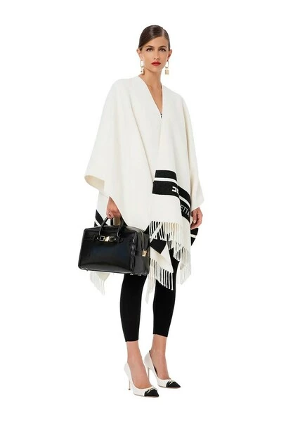 Elisabetta franchi cape gemaakt van boterkleurige wolmix met contrasterend logo-detail. V-neck, omzoomde zoom.
