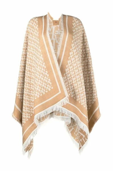 Elisabetta franchi jassen kameel karamel bruin monogram print gebreide cape van Elisabetta franchi met fijn gebreide, monogrampatroon, logo -print op de zoom, gerafelde zoom, wikkelstijl en cape -ontwerp. One Size Designer ID: MT02F26E2 Z60
