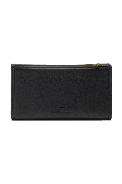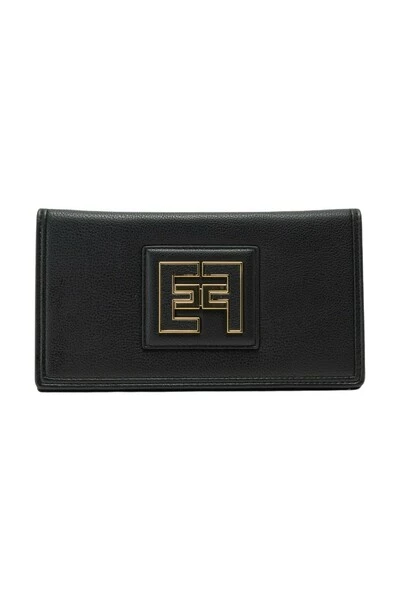 Elisabetta franchi-portefeuilles zwarte trifold model portemonnee in granaat-print imitatie leer, voor motief, metalen logo-plaquette en kleur gematcht inleg. Goudkleurig galvanisch. Afneembare mini -serviceketen. Dubbele draagbaarheid met de hand of schouder. Details: – Samenstelling: 59% polyester 22% houtstof 19% polyurethaan – Grootte: 21,5 cm x 12 cm x 1,5 cm
