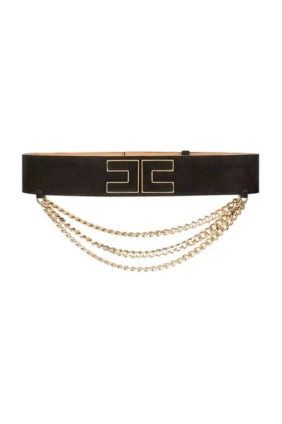 Elisabetta franchi-riemen zwarte high-tailed riem in gesplitst suede met logo plaquette bedekt met gesplitste suede en val van voorketens in antiek goud. – Hoogte: 5 cm – Samenstelling: 100% leer