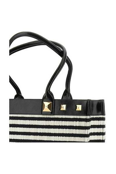 Elisabetta franchi Elisabetta franchi schoudertas, zwart en wit, shoppermodel, in gestreepte chenille-gesteunde stof, details in glanzend verfrommeld synthetisch materiaal en gefacetteerde gele goudkleurige metalen, voering in suède-effect synthetisch materiaal, binnenzak met zip- en logo-patch, Voeten metaal aan de zoom, dubbele buisvormige handgreep. Afmetingen: lengte 38 cm, hoogte 25 cm, diepte 12 cm.