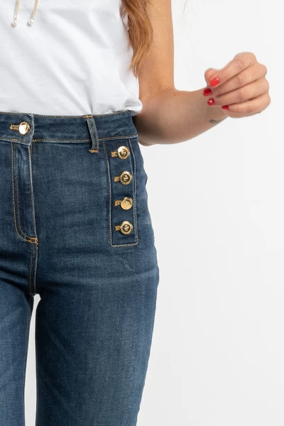 Elisabetta franchi jeans blauwe palazzo been jeans in stretch denim met knoppen op het bekken, logo -knoppen in gouden metaal en plaquette genaaid op de achterzak. 99% katoen 1% elastaan