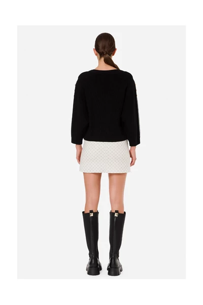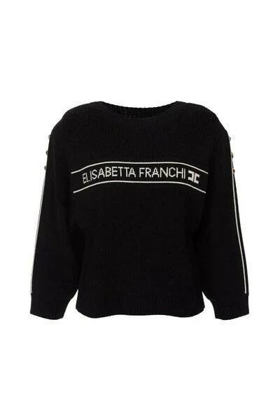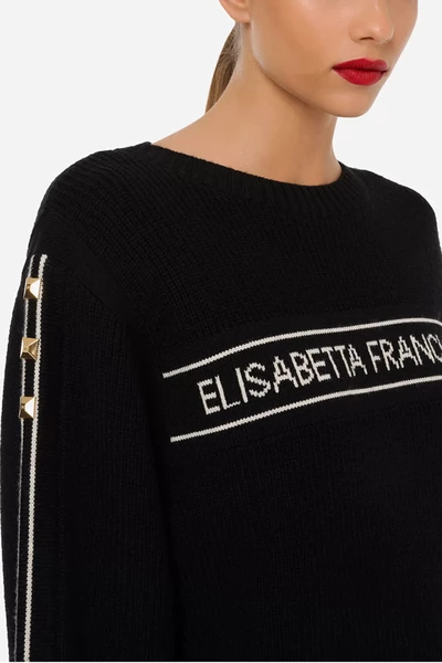 Elisabetta franchi zwarte shirts/boter trui in gemengde wol, van het volume tot de doos en de bemanning. Op de mouwen zijn twee contrastbanden met Maxi Logo Studdes op de schouders geplaatst. Aan de voorkant registreerde een bende in contrast Jacquard.