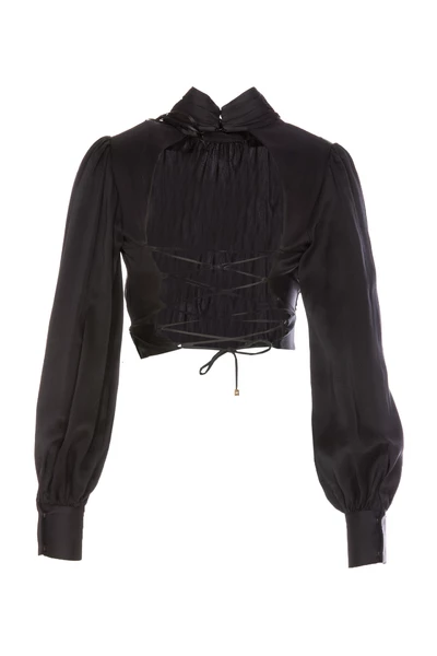 Elisabetta franchi shirts zwarte vrouw gewas shirt, laterale ritssluiting, veters sluiting aan de achterkant, haak sluiting op de kraag