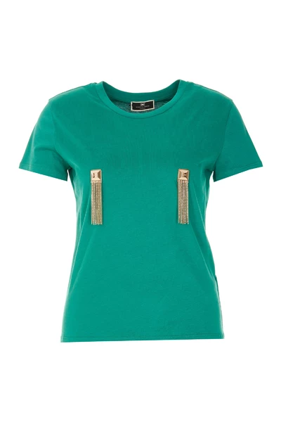 Elisabetta Franchi Sweaters Green Woman T-shirt, Crewneck, Frontal Plaque-logo met kristallen details