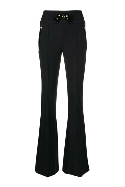 Elisabetta-franchi-broek Zwart hoog-taille bootcut-broek uit Elisabetta-franchi met jetzwart, goudkleurige hardware, goudkleurige studionering, boogdetails, hoog getailleerde, twee zijkant zip-snelle zakken en bootcut.